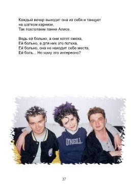 Каждый вечер выходит она из себя и танцует на шатком карнизе, Так похлопаем панне Алисе. Ведь ей больно, а они хотят смеха, Ей больно, а для них это потеха, Ей больно, она не находит себе места, Ей боль... Но кому это интересно? 27