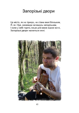 Запорізькі двори Це місто, як не прикро, не стане мені близьким, Я, як і був, назавжди залишусь запорізьким, І коли у небі горять лише для мене відомі вогні, Запорізькі двори насняться мені. 45